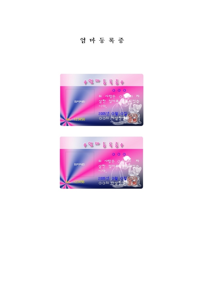 엄마등록증입니다. 자녀가 엄마에게 주는 서식으로 자신의 엄마로서 몇가지 약속을 지키겠다는 내용의 등록증입니다.