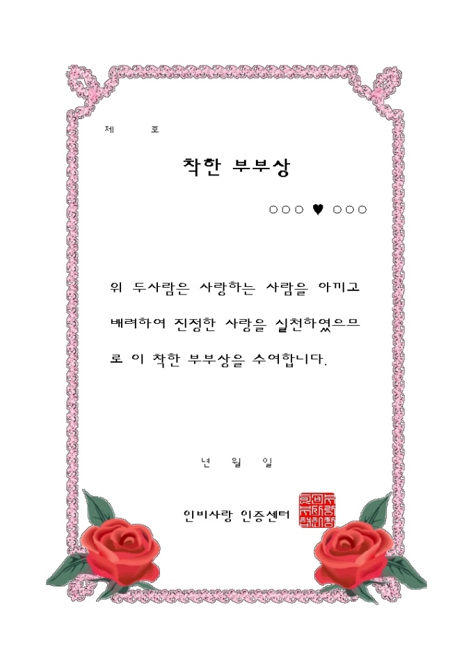 착한부부상입니다. 부부가 서로에게 잘하고 약속을 잘지켰을때 그 부부에게 주는 상장으로 이미지가 첨부되어 진 서식입니다.