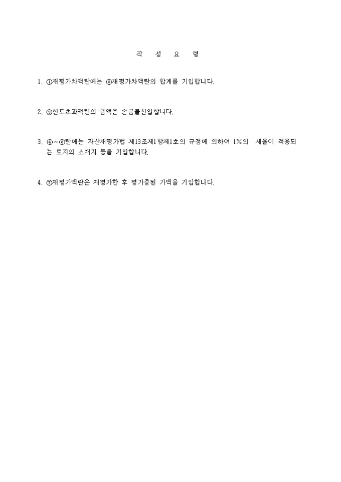 9,000원/월[별지 제38호 서식] 재평가차액상당액손금산입조정명세서 양식입니다. [작 성 요 령] 1. ①재평가차액란에는 ⑧재평가차액란의 합계를 기입합니다. 2. ③한도초과액란의 금액은 손금불산입합니다. 3. ④∼⑧란에는 자산재평가법 제13조제1항제1호의 규정에 의하여 1%의 세율이 적용되는 토지의 소재지 등을 기입합니다. ...