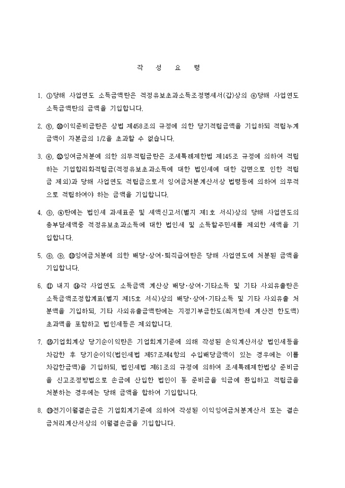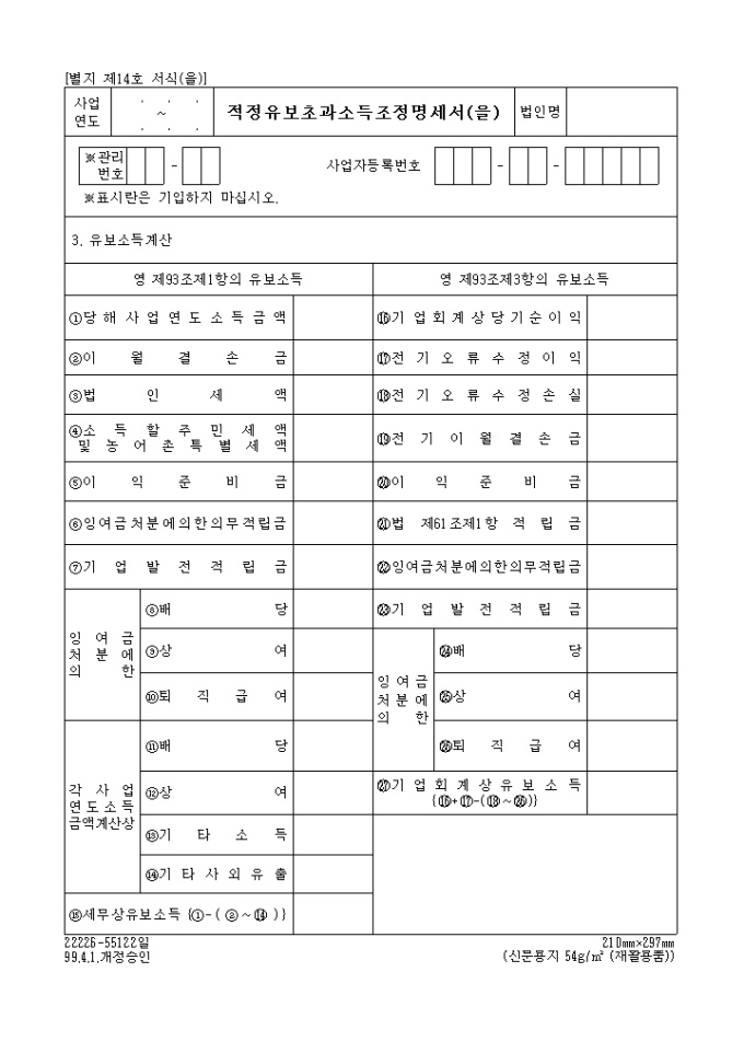9,000원/월[별지 제14호 서식(을)] 적정유보초과소득조정명세서(을) 양식입니다. [작 성 요 령] 1. 당해 사업연도 소득금액란은 적정유보초과소득조정명세서(갑)상의 당해 사업연도 소득금액란의 금액을 기입합니다. 2. , 이익준비금란은 상법 제458조의 규정에 의한 당기적립금액을 기입하되 적립누계금액이 자본금의 1/2을 초과할 수 없습니다. 3. , 잉여금처분에 의한 의무적립금란은 조세특례제한법 제145조 규정에 의하여 적립하는