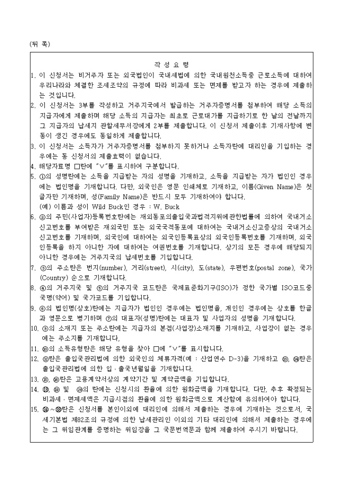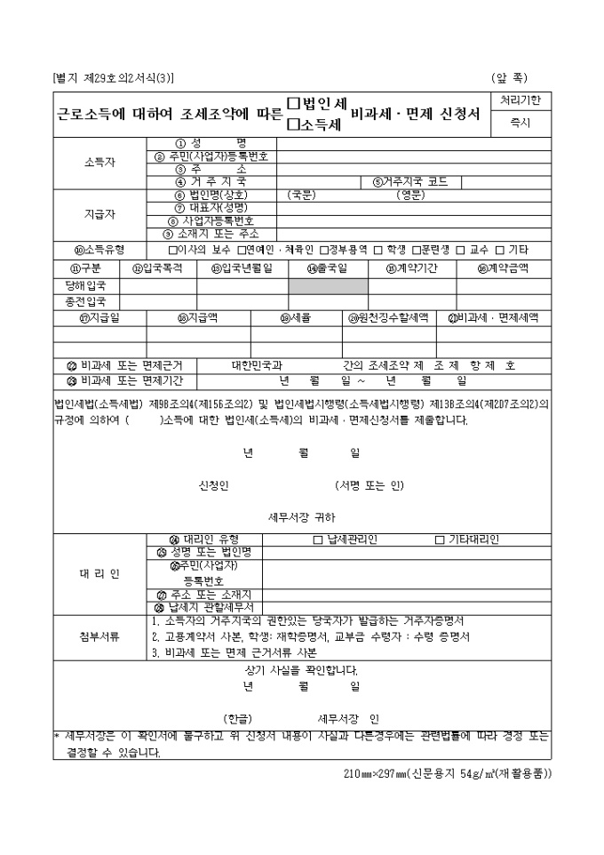 9,000원/월[별지 제29호의2서식(3)]근로소득에 대하여 조세조약에 따른 비과세, 면제신청서입니다.