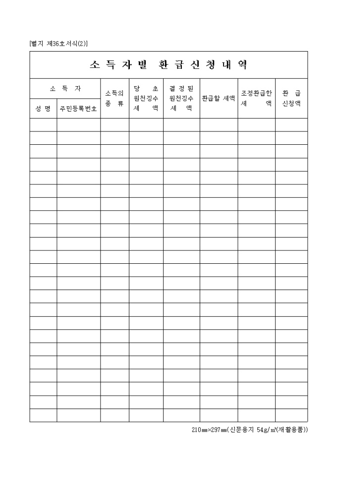 [별지 제36호서식(2)]소득자별 환급신청내역입니다.
