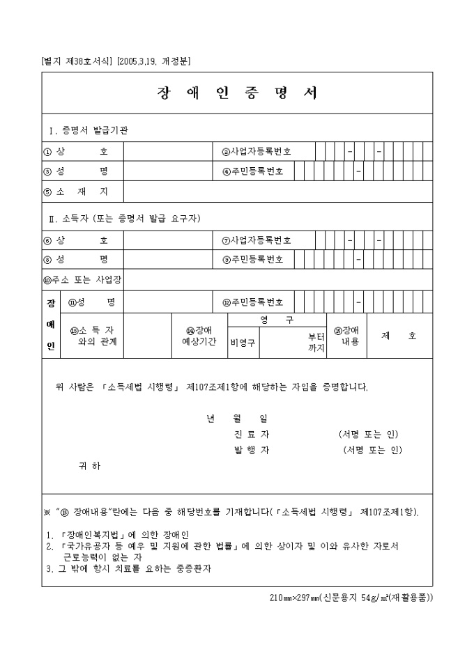 9,000원/월[별지 제38호서식]장애인증명서(2005.3.19.개정분)입니다.