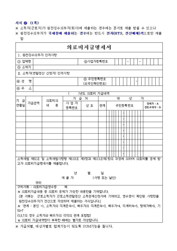 9,000원/월[별지 제43호서식]의료비지급명세서입니다. 연말정산시 필요한 서식으로 의료비 지급부분에 대한 소득공제를 위하여 증빙서류제출을 위한 의료비 지급 명세서 양식입니다.