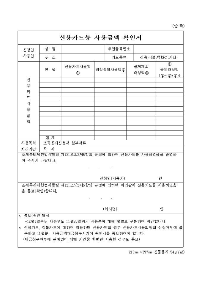 9,000원/월조세특례제한법시행령 제121조의2제5항의 규정에 의한 신용카드 등 사용금액 확인서입니다