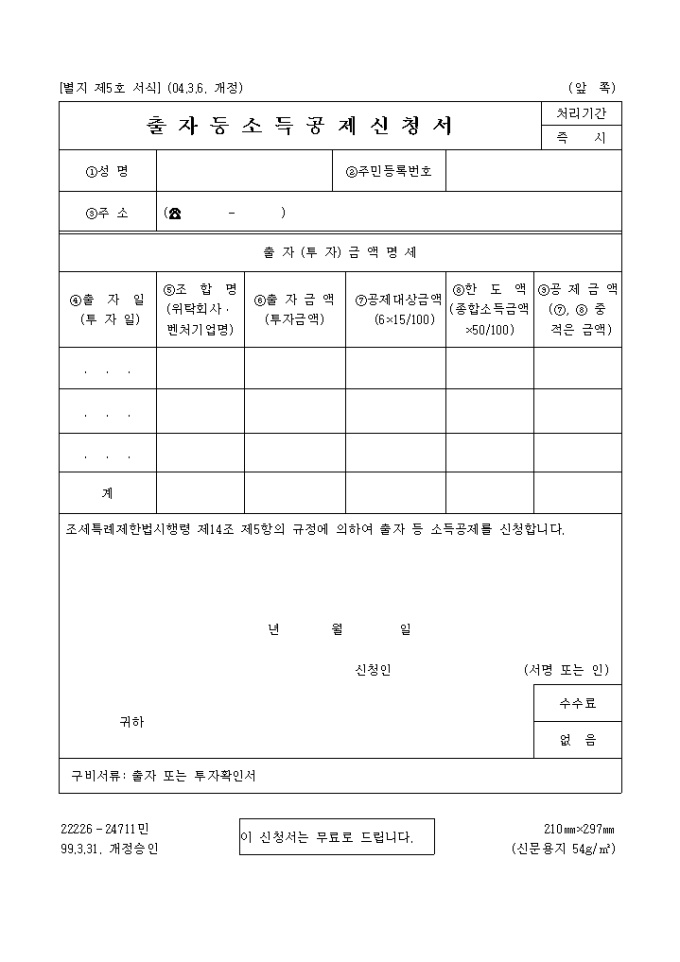 조세특례제한법시행령 제14조 제5항의 규정에 의하여 출자 등 소득공제를 신청하는 출자 등 별지제5호 소득공제신청서 양식입니다