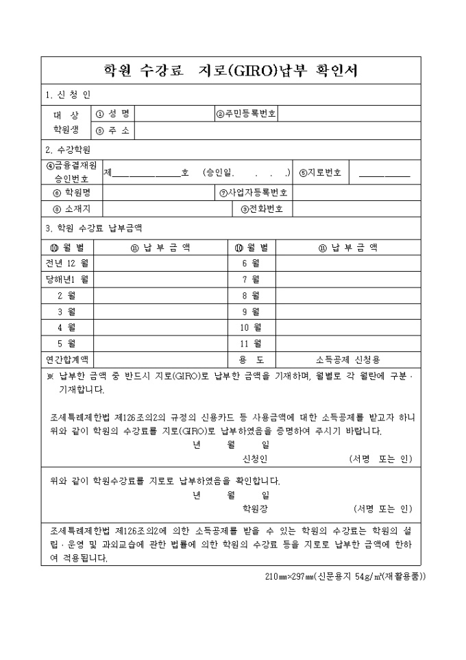 9,000원/월조세특례제한법 제126조의2의 규정의 신용카드 등 사용금액에 대한 소득공제를 받고자 하니 학원의 수강료를 지로(GIRO)로 납부하였음을 증명하여 주시기 바라는 학원 수강료 지로(giro)납부 확인서 양식입니다