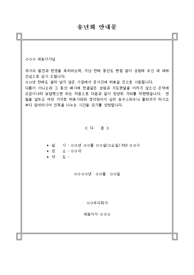 한해가 저물어 가면서 송년회를 개최해 한해를 마무리하고 인사를 나누는 자리에 참여 해 줄것을 부탁하는 안내문 양식입니다.