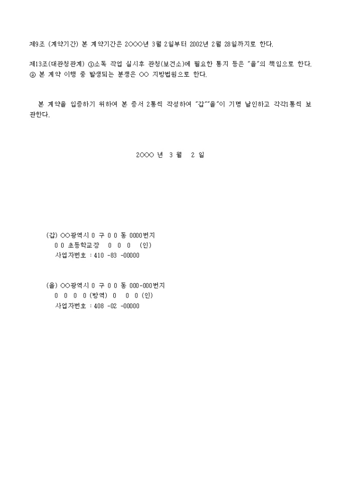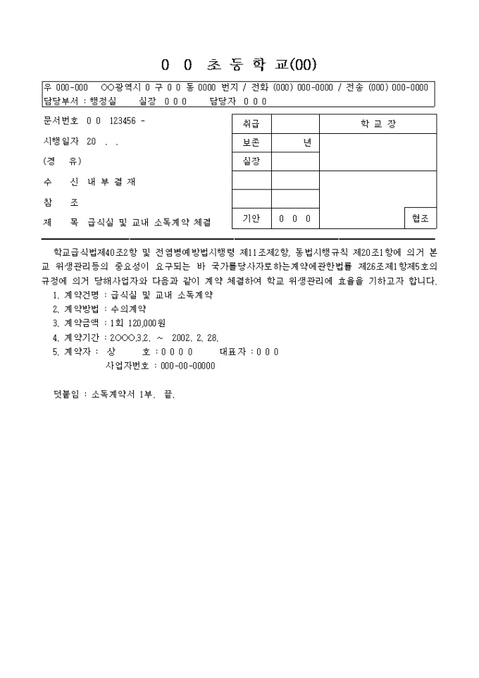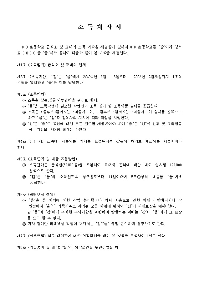 사우회서식으로 교내 및 급실실에 소독을 정기적으로 하는 업체와의 계약서식입니다.