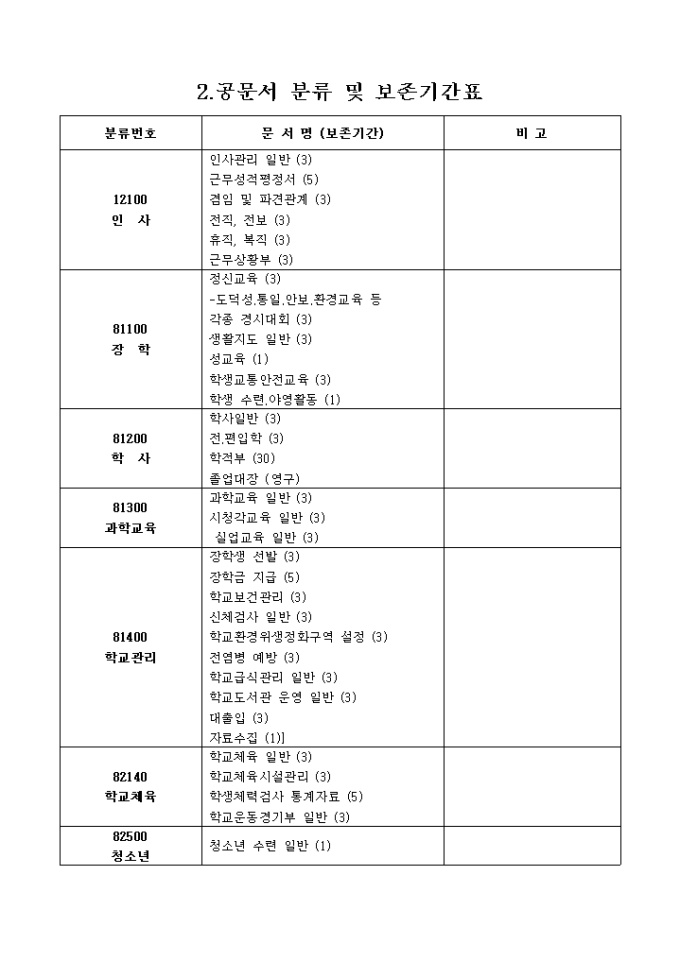 [사우회] 02.공문서 분류 및 보존기간표입니다. 인사, 장학, 학사, 과학교육, 학교관리, 학교체육, 청소년의 분류에 따른 문서들의 보조기간을 정리한 표 양식입니다.