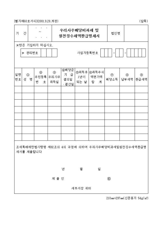 9,000원/월[2005년연말정산]우리사주배당비과세 및 원천징수세액환급명세서 양식입니다.