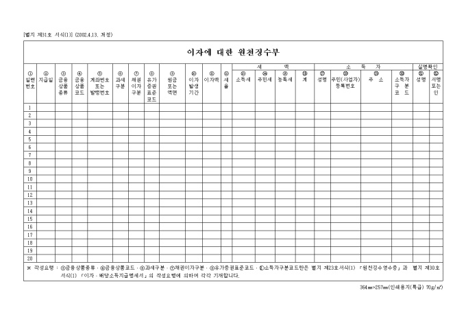2005년 연말정산시 필요한 서식으로 이자에 대한 원천 징수부 양식입니다.
