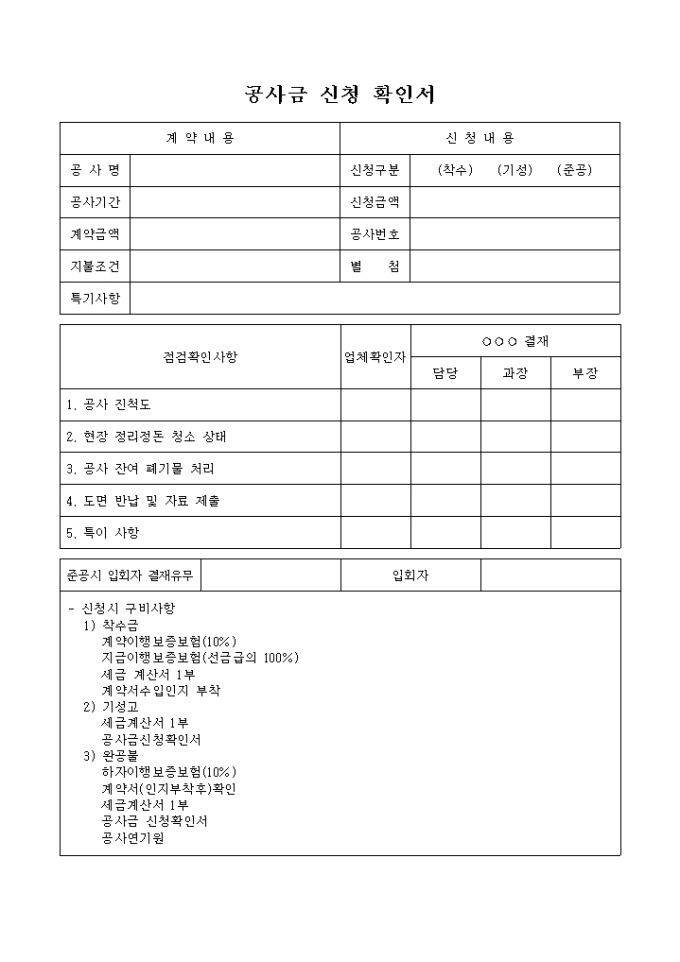 9,000원/월공사금신청확인서입니다. 공사금에 대한 계약내용(공사명, 공사기간, 계약금액 등)을 명시하고 공사금의 내역 및 구비사항등을 명시하는 신청 확인서 양식입니다.