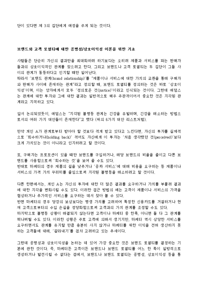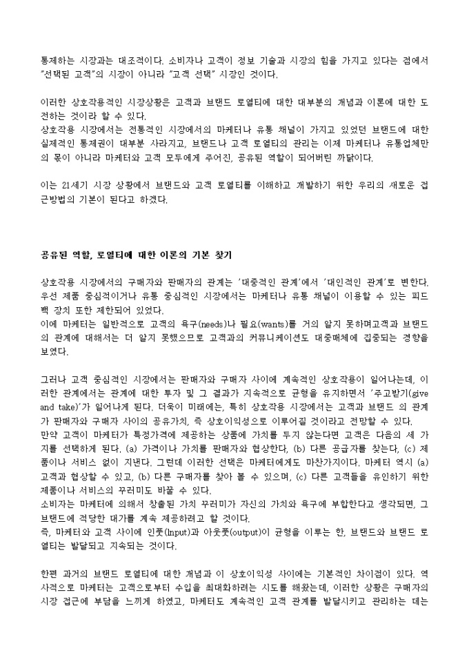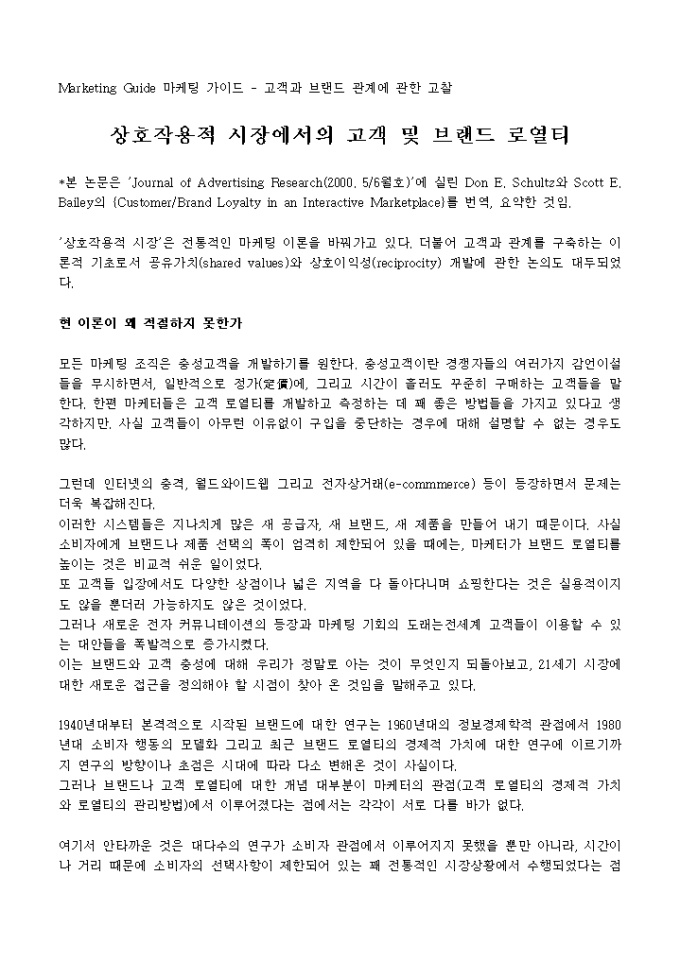 9,000원/월(Marketing Guide) 마케팅 가이드입니다. 본 서식은 ´Journal of Advertising Research(2000. 5/6월호)´에 실린 Don E. Schultz와 Scott E. Bailey의 {Customer/Brand Loyalty in an Interactive Marketplace}를 번역, 요약한 것입니다.