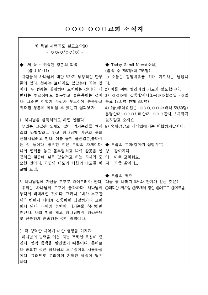 교회에서 새로운 소식이나 알림말을 각 가정에 보내고자 할때 사용하는 서식입니다.