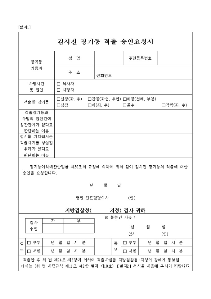 장기이식에 관하여 검사전에 장기 부분을 적출하고자 할때 승인을 요청하는 양식입니다.