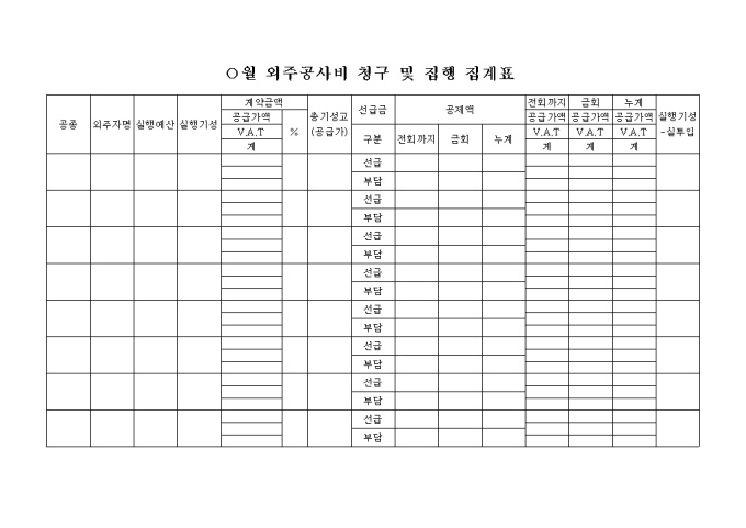 공종명, 외주자명, 실행예산, 실행기성, 계약금액내의 공급가액, 부가가치세, 공제액 등을 기입하여 월별로 외주공사비의 내역을 기입할 수 있는 양식입니다.