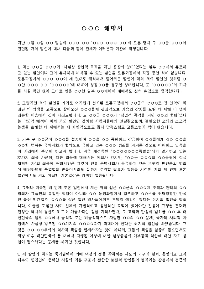 지난 ○월 ○일 ○○ 방송의 ○○○ ○○ ´○○○ ○○○ ○○´의 토론 당시 구 ○○군 ○○○와 관련된 저의 발언에 대해 다음과 같이 관계자 여러분과 기관에 해명하는 양식입니다.