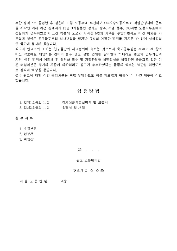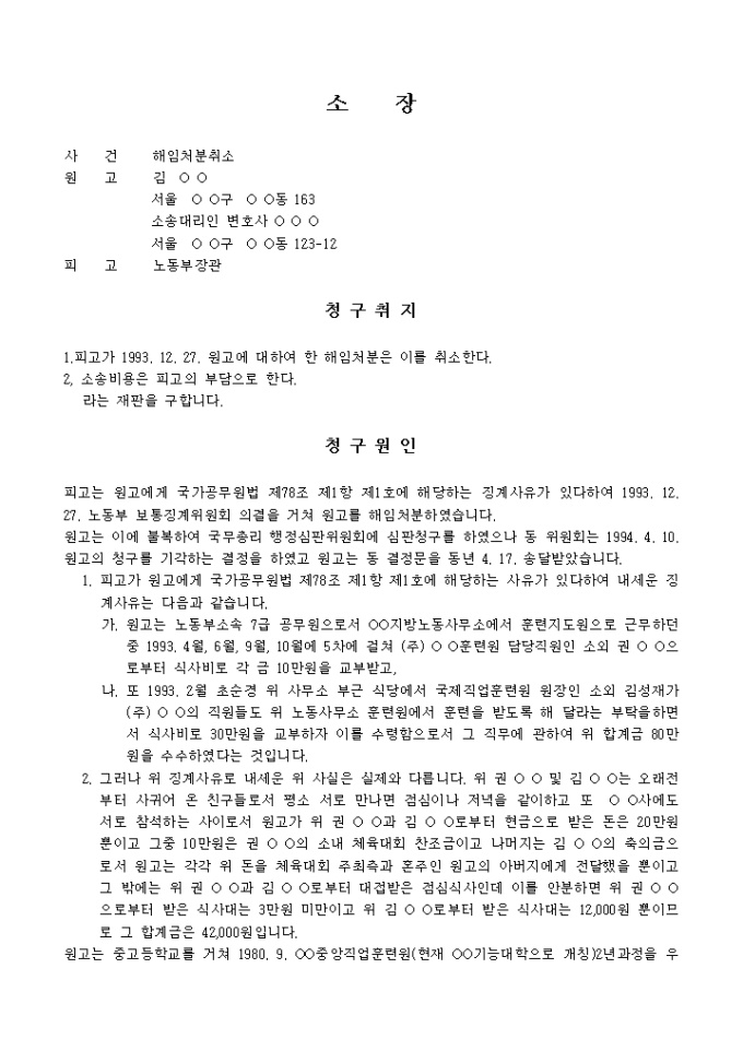 9,000원/월소장해임처분취소의소입니다. 피고가 1993. 12. 27. 원고에 대하여 한 해임처분은 이를 취소한다. 소송비용은 피고의 부담으로 한다.라는 재판을 구하는 내용의 서식입니다.