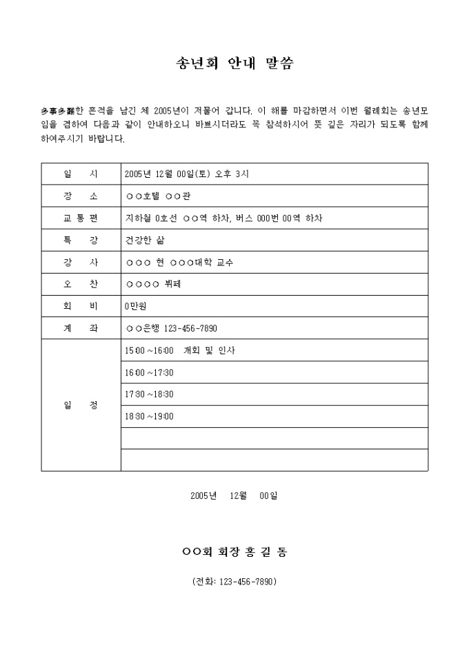 송년회 안내장(일정, 계좌포함)