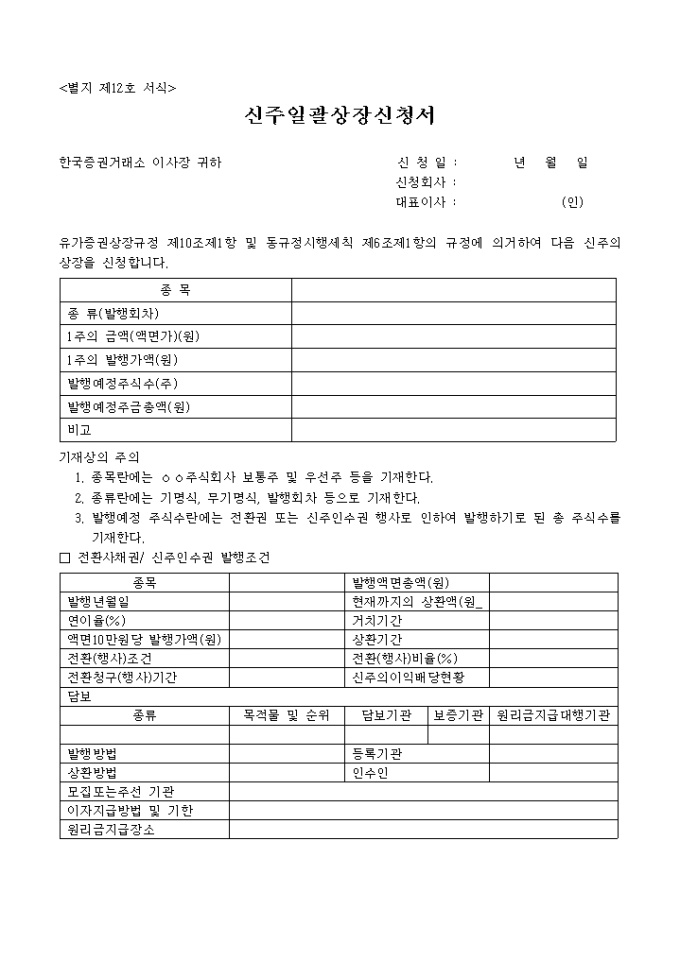 신주일괄상장신청서입니다. 유가증권상장규정 제10조제1항 및 동규정시행세칙 제6조제1항의 규정에 의거하여 다음 신주의 상장을 신청하는 내용의 서식입니다.