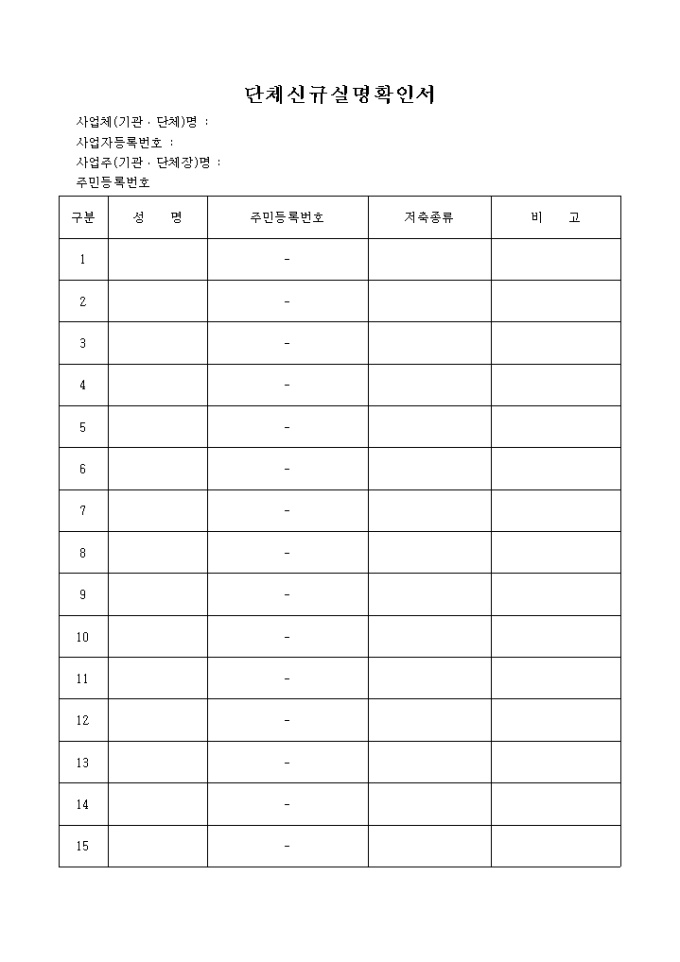 9,000원/월단체신규실명확인서입니다. 사업체(기관, 단체)명, 사업자등록번호, 사업주(기관, 단체장), 주민등록번호등을 기입하여 단체의 신규 가입시 실명 확인을 하는 서식입니다.