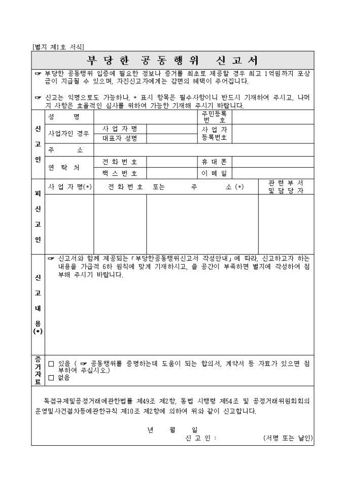 부당한 공동행위 입증에 필요한 정보나 증거를 최초로 제공할 경우 최고 1억원까지 포상금이 지급될 수 있으며, 자진신고자에게는 감면의 혜택이 주어지므로 이에 신고하는 내용의 서식입니다.