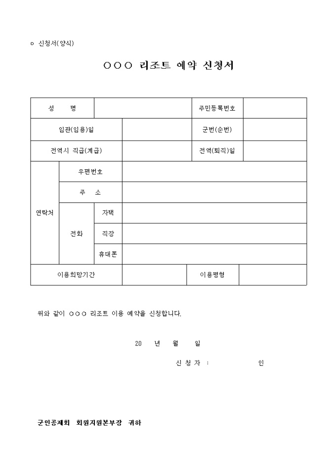 9,000원/월예약신청서입니다. 군인공제협회 서식으로 이 소속에 속한 회원이 리조트를 빌리고자 할때 사용하는 예약 신청서 양식입니다.