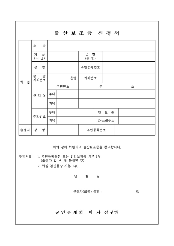 출산보조금신청서입니다. 군인공제회의 서식으로 협회에 가입한 회원 자녀 출산보조금을 신청하는 내용의 양식입니다.