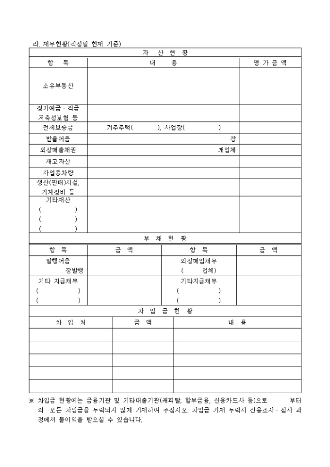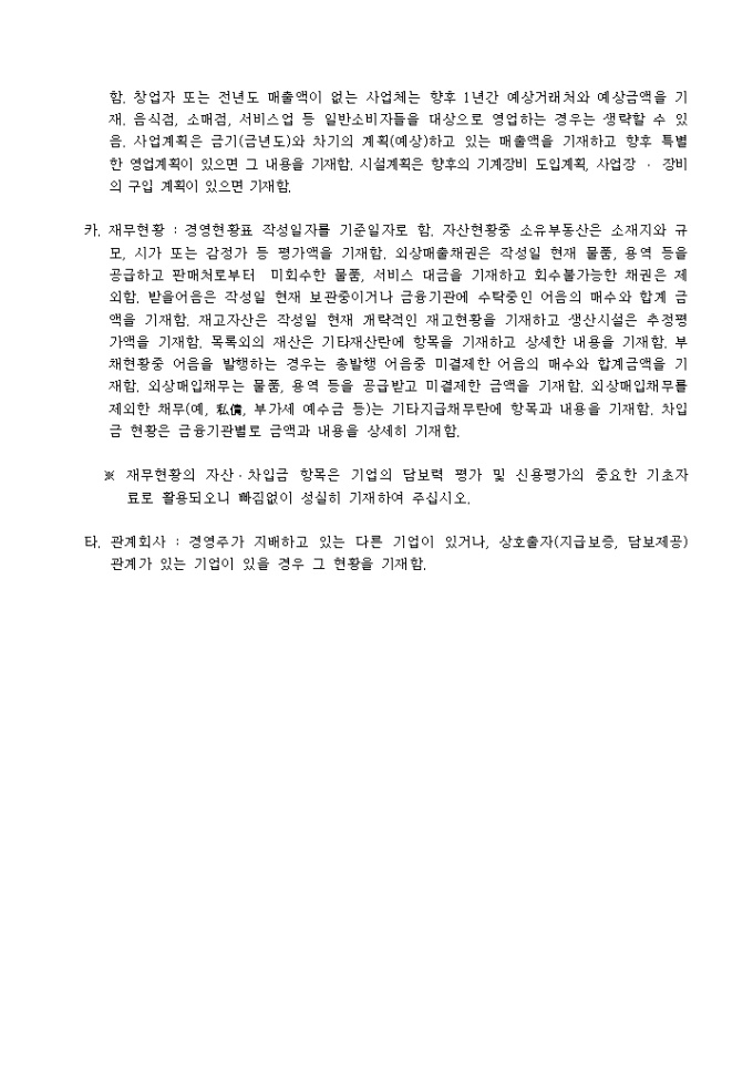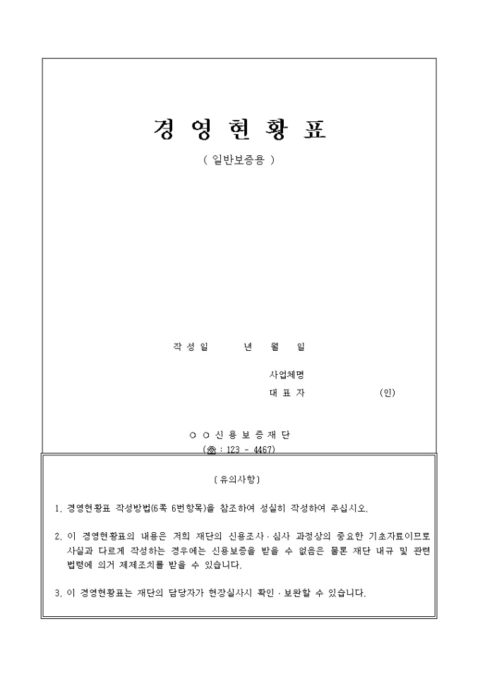 9,000원/월경영현황표(일반보증)입니다. 경영현황표의 내용은 각 재단의 신용조사·심사 과정상의 기초자료로서 재단 내규 및 관련 법령에 의거 하여 각 란에 내용을 기입하는 양식입니다.