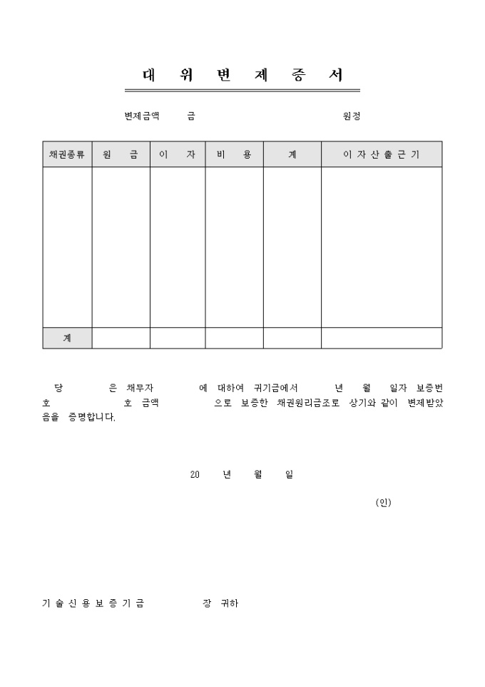 9,000원/월대위변제증서입니다. 채권에 대하여 귀기금에서 정한 날짜일로부터 다음 금액을 채권원리금조로 상기와 같이 변제받았음을 증명하는 서식입니다.