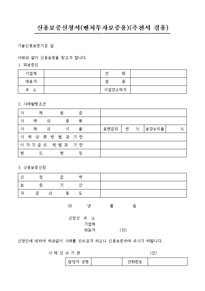신용보증신청서(벤쳐투자보증용)입니다. 신청인에 대하여 위와같이 사채를 인수코자 하오니 신용보증하여 주시기 바라는 내용의 서식입니다.