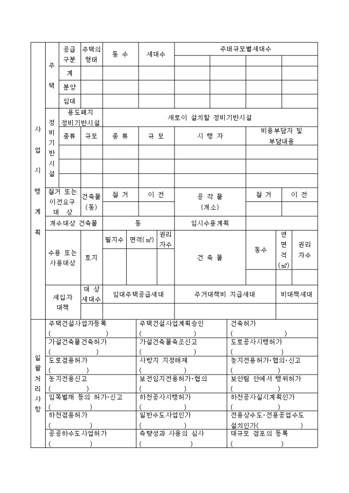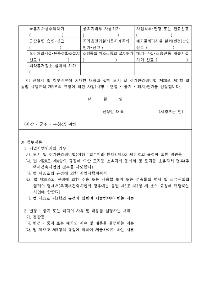 신청서 및 첨부서류에 기재한 내용과 같이 도시 및 주거환경정비법 제28조 제1항 및 동법 시행규칙 제9조의 규정에 의한 사업(시행 · 변경 · 중지 · 폐지)인가를 신청합니다.