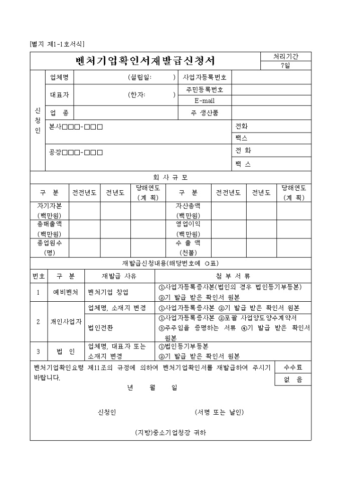 벤쳐기업확인서 재발급신청서