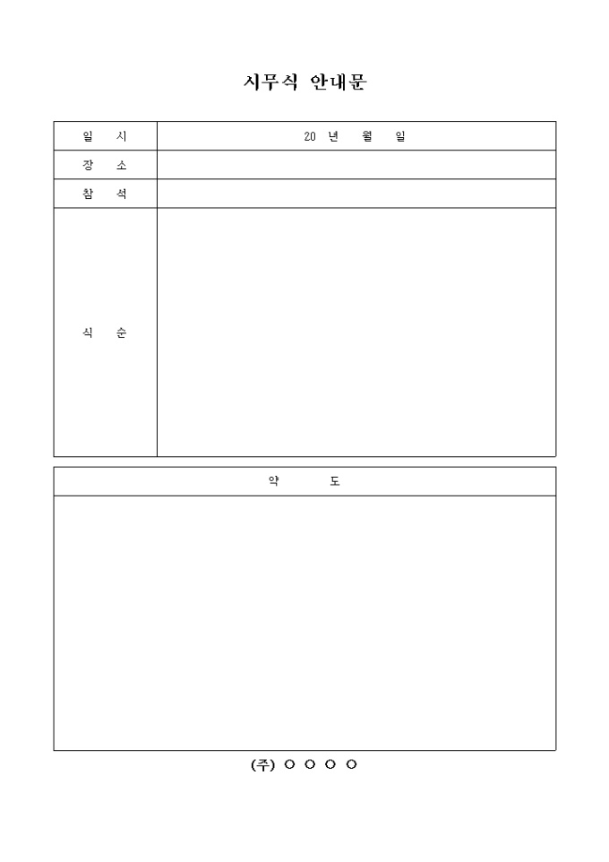 9,000원/월일시, 장소, 참석, 식순을 기재형식에 알맞게 적절하게 배분하였고 약도를 포함시켜 시무식이 외부에서 진행되거나 참석자가 시무식 장소를 잘모를경우에 사용할 수 있는 시무식 안내문 입니다.