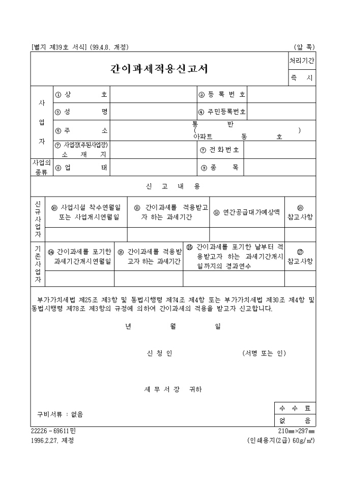 [별지 제39호 서식] 간이과세적용신고서 양식입니다. 부가가치세법 제25조 제3항 및 동법시행령 제74조 제4항 또는 부가가치세법 제30조 제4항 및 동법시행령 제78조 제3항의 규정에 의하여 간이과세의 적용을 받고자 신고하실때 사용하는 양식입니다.