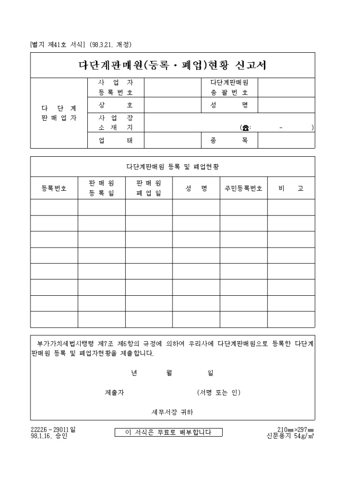 부가가치세법시행령 제7조 제6항의 규정에 의하여 우리사에 다단계판매원으로 등록한 다단계판매원 등록 및 폐업자현황을 제출하실때 사용하는 양식입니다.