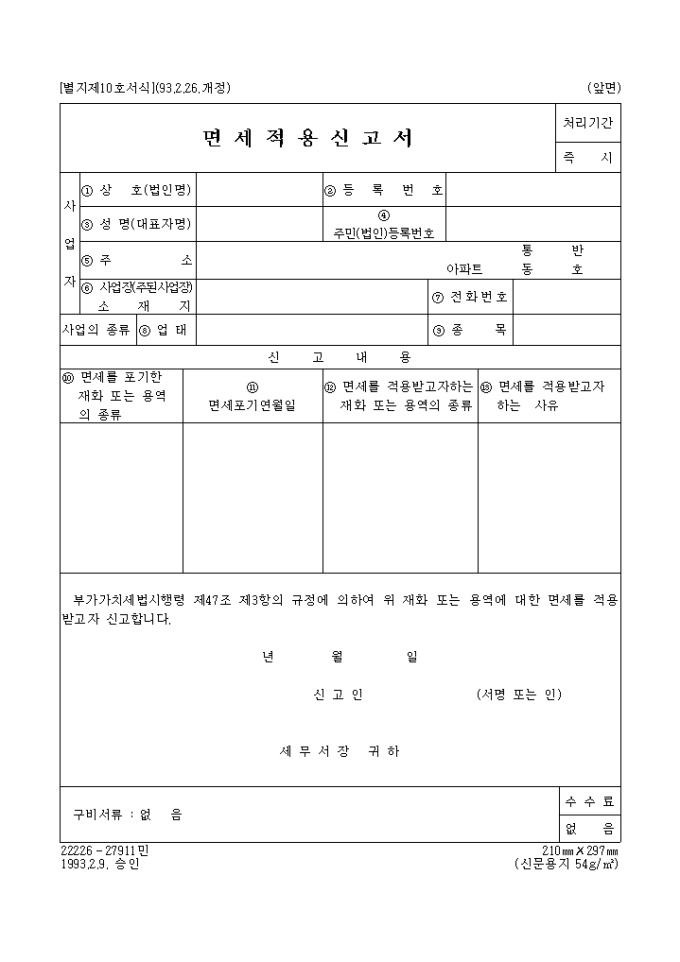 면세적용신고서(부가가치세법 제10호)