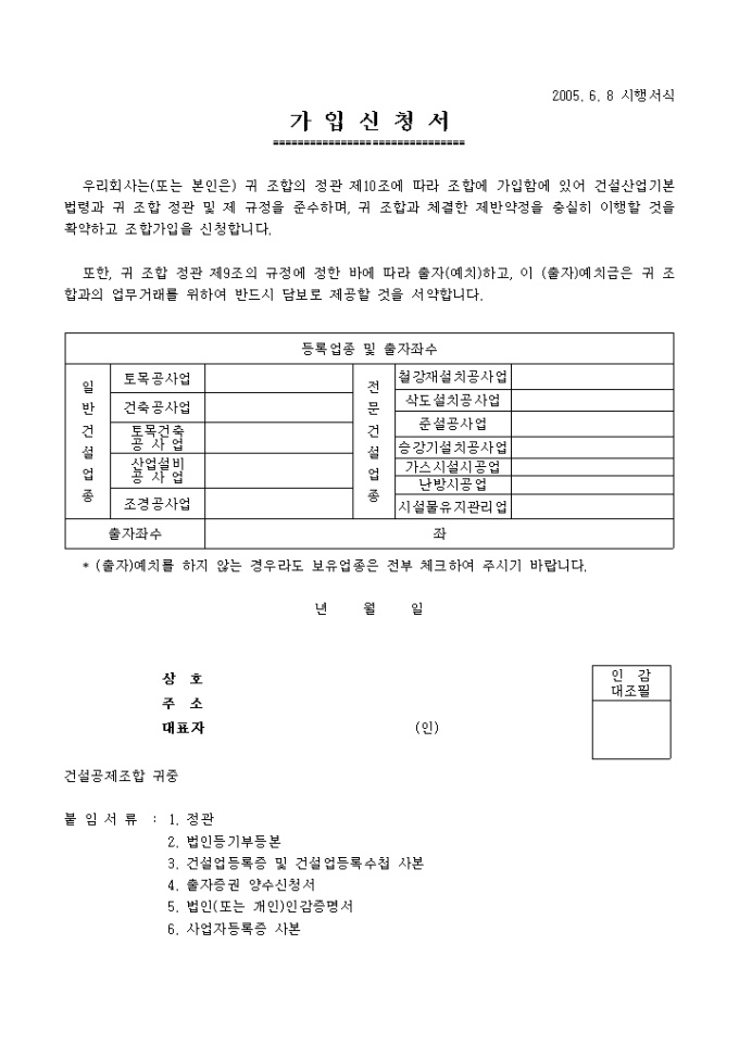 9,000원/월가입신청서입니다. 조합의 정관 제10조에 따라 조합에 가입함에 있어 건설산업기본법령과 귀 조합 정관 및 제 규정을 준수하며, 귀 조합과 체결한 제반약정을 충실히 이행할 것을 확약하고 조합가입을 신청하는 내용입니다.