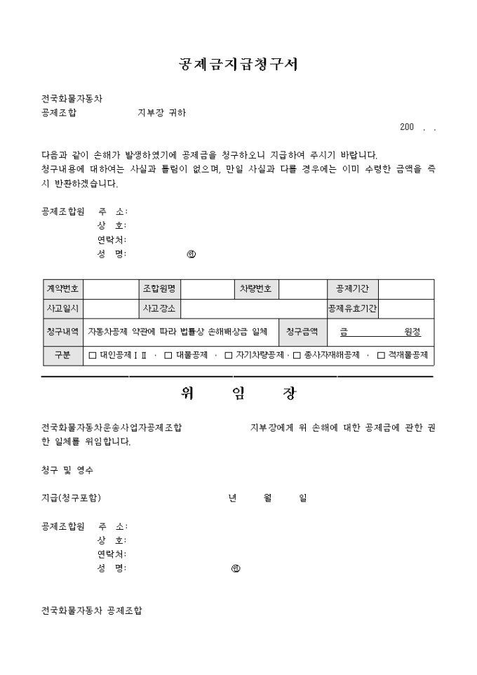 공제금지급청구서입니다. 손해가 발생하였기에 공제금을 청구하오니 지급하여 주시기 바랍니다. 청구내용에 대하여 는 사실과 틀림이 없으며, 만일 사실과 다를 경우에는 이미 수령한 금액을 즉시 반환하겠다는 내용입니다.