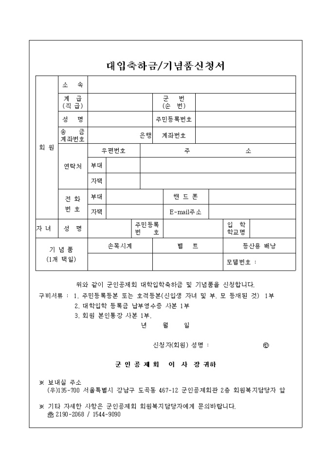 9,000원/월대입축하금신청서입니다. 군인공제회의 회원의 자녀가 대학에 합격하였을경우 축하금으로 얼마를 지급함에 있어 신청하는 양식입니다.