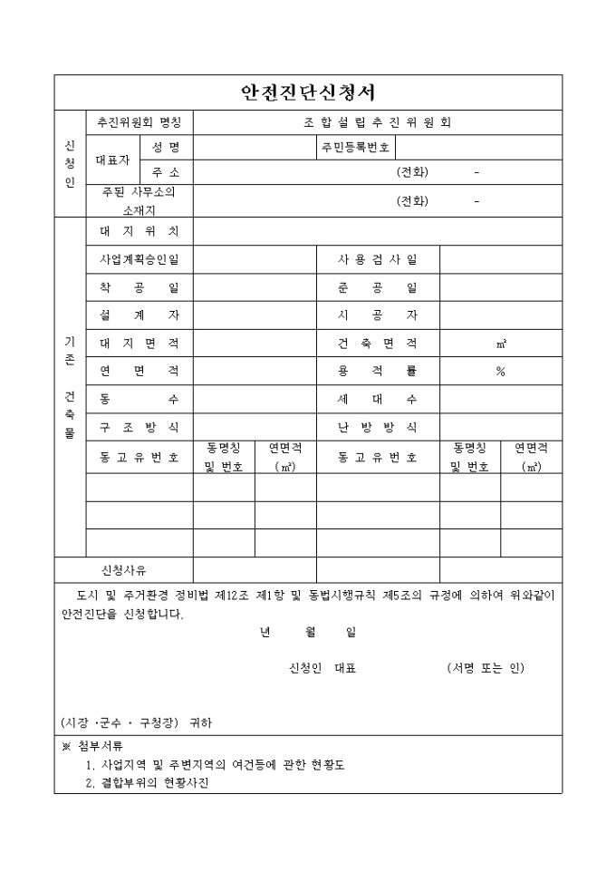 9,000원/월안전진단신청서입니다. 도시 및 주거환경 정비법 제12조 제1항 및 동법시행규칙 제5조의 규정에 의하여 위와같이 안전진단을 신청하는 서식입니다.
