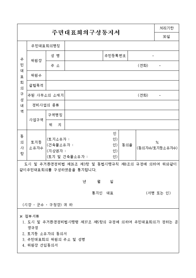 주민대표회의구성통지서입니다. 도시 및 주거환경정비법 제26조 제3항 및 동법시행규칙 제8조의 규정에 의하여 위와같이 같이주민대표회의를 구성하였음을 통지하는 서식입니다.