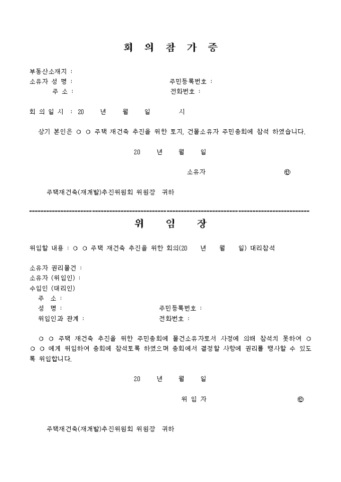 회의참가증입니다. 기 본인은 ○ ○ 주택 재건축 추진을 위한 토지, 건물소유자 주민총회에 참석을 증명하는 회의 참가증입니다.