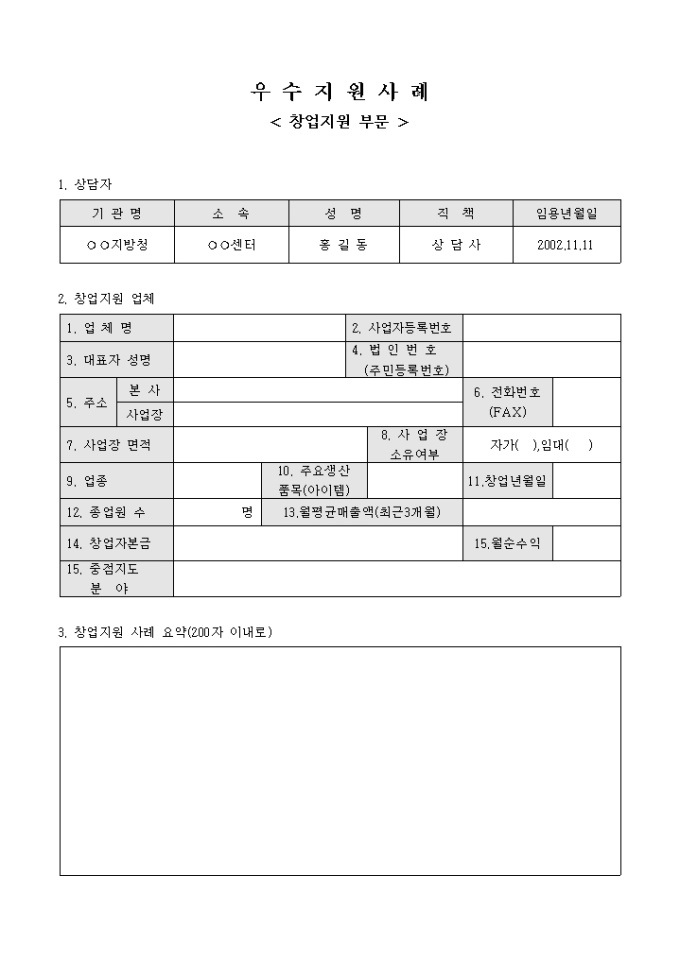 우수지원사례(창업지원부문)입니다. 창업한 기업중에서 창업의 아이템 부분에서 우수한 기업의 사례를 작성하는 서식입니다.