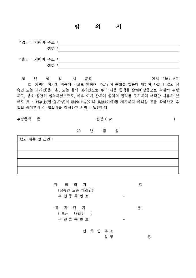 교통사고합의서입니다. 일체의 권리를 포기하며 어떠한 사유가 있어도 民 刑事上(민 형사상)의 訴訟(소송)이나 異議(이의)를 제기하지 아니할 것을 확약하는 내용의 합의서입니다.