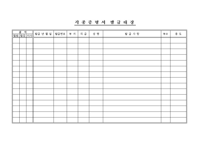 9,000원/월각종증명서발급대장입니다. 각 증명서 발급시 그에 해당하는 내용을 기입하여 보관하는 발급대장 양식입니다.