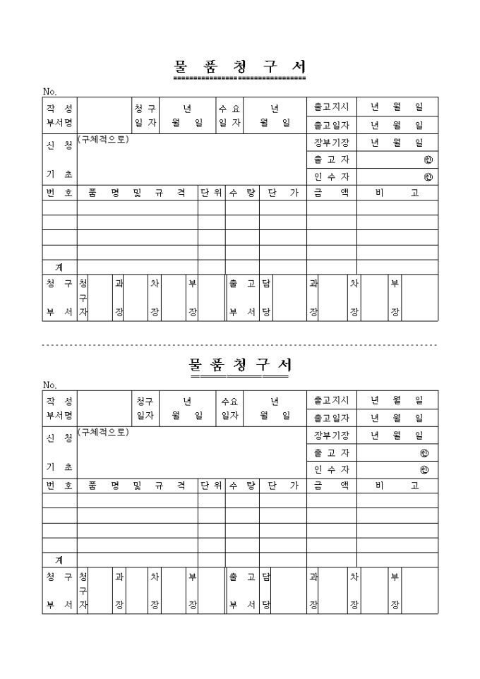 9,000원/월물품청구서입니다. 부서명, 청구일자, 수요일자, 청구자 등을 명시하여 물품을 구입할 때 사용하는 물품 청구서 양식입니다.