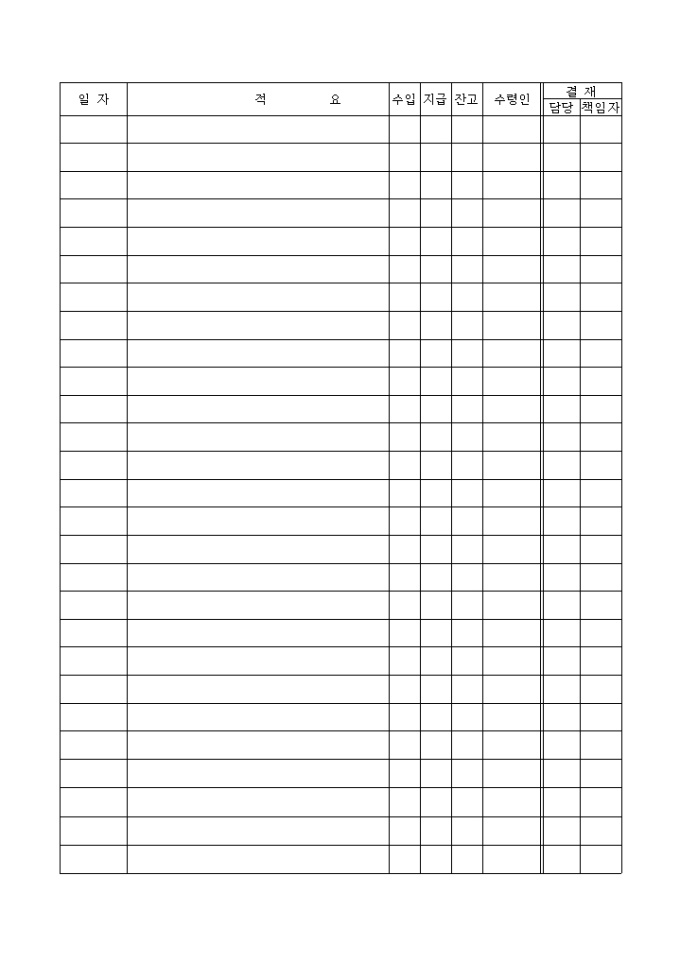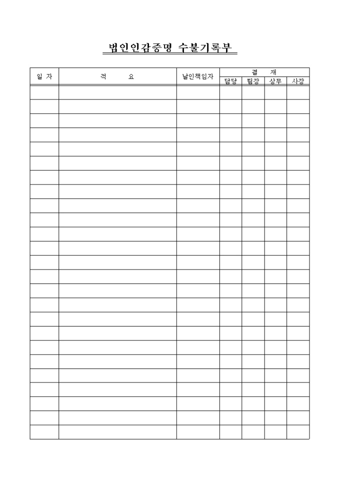 일자, 적요, 날인책임자, 결재부분으로 법인 인감 증명에 대한 수불 기록부 양식입니다.