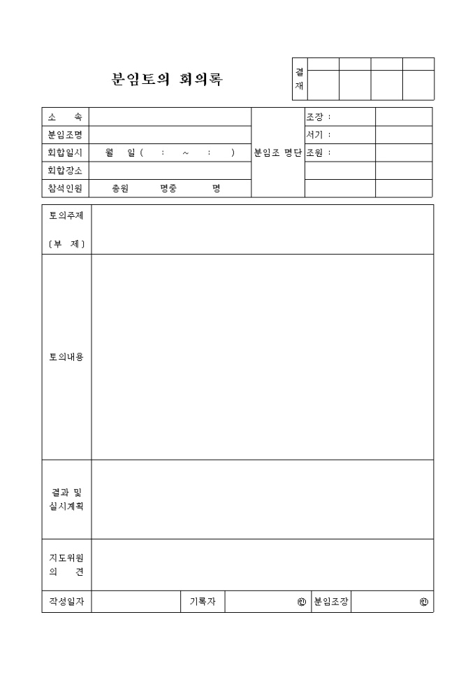 9,000원/월분임토의회의록입니다. 분단별로 토의를 하여 그 내용의 결과를 내고자 할때 회의 내용에 대하여 기록하는 분임 토의 회의록 입니다.
